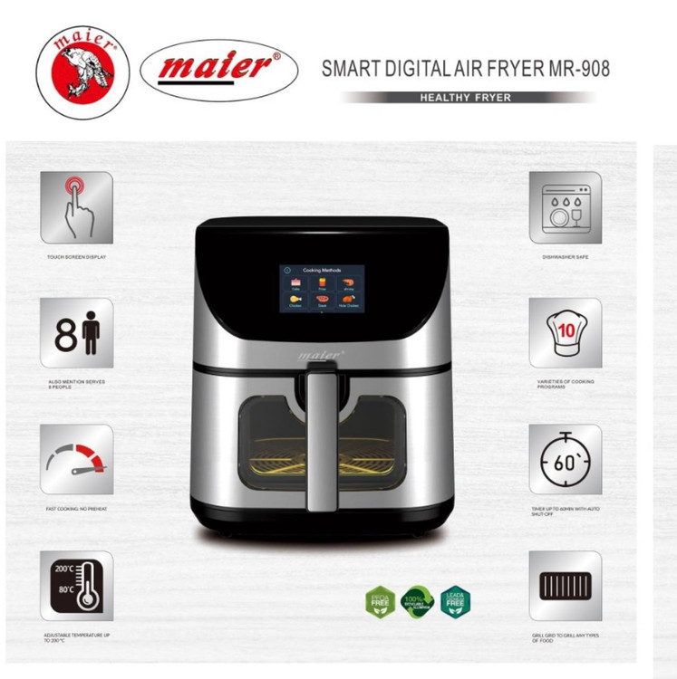 علاوه بر طراحی ظاهری بسیار شیک با بدنهای از استیل ضدزنگ و پنل مشکی، این سرخکن با بهرهگیری از فناوری گردش هوای داغ (Air Fryer) عملکردی فوقالعاده کمچرب دارد و امکان پخت غذاهای سالمتر و با حداقل روغن را فراهم میکند. سرخ کن MR-908 با حفظ طعم و بافت اصلی مواد غذایی، چربی اضافی را تا حد زیادی کاهش میدهد و این موضوع به ویژه برای افرادی که به سلامت تغذیه اهمیت میدهند، یک مزیت بزرگ محسوب میشود.