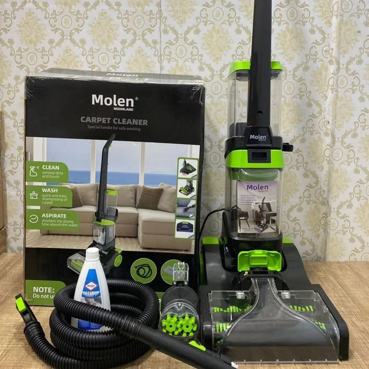 جاروبرقی فرش شوی و مبل شوی خانگی مارک مولن Molen آلمان یک محصول عالی برای جارو و شستن انواع فرش و مبل در منزل است. این دستگاه قالیشویی خانگی، بخارشوی فرش و جارو فرش شوی نیز نام دارد. جاروبرقی فرش شوی خانگی همه کاره مولن با توان مصرفی 1800 وات و قدرت مکش فوق العاده ی 800 وات یک دستگاه فرش شوی و مبل شویی کامل برای شستشوی فرش و مبل و جارو کردن منزل شما می باشد. قالیشویی، مبل شویی، بخار شوی، کف شور، خشک کن، جاروبرقی از قابلیت های این دستگاه فرش شوی برقی همه کاره فوق العاده می باشد.