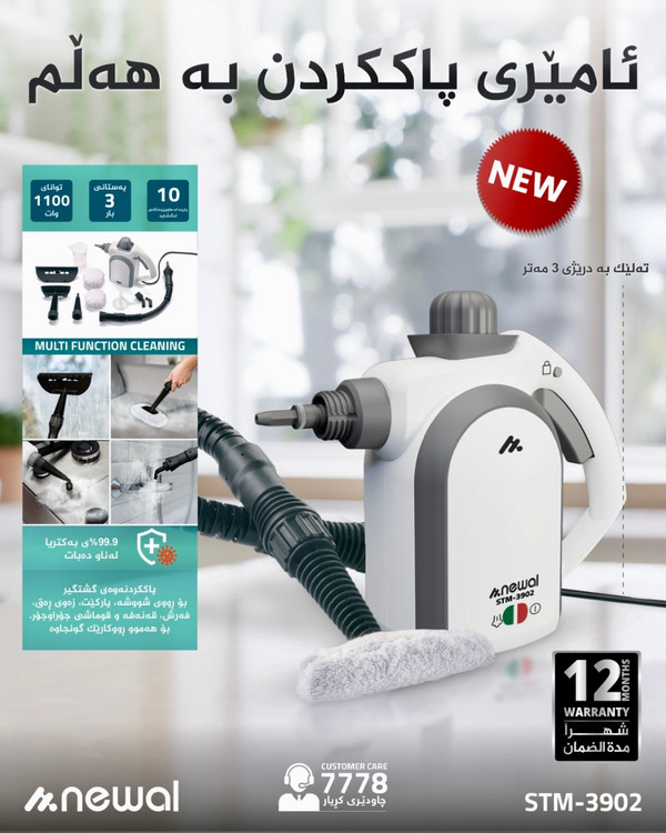 بخار شور دستی نیوال MOdel:STM_3902، این دستگاه با توان مصرفی 1100 وات و فشار بخار واقعی 3 بار، در مدت زمان کوتاه تنها ۲ دقیقه آماده کار میشود و تا ۲۰ دقیقه بهصورت مداوم بخار قدرتمند تولید میکند.