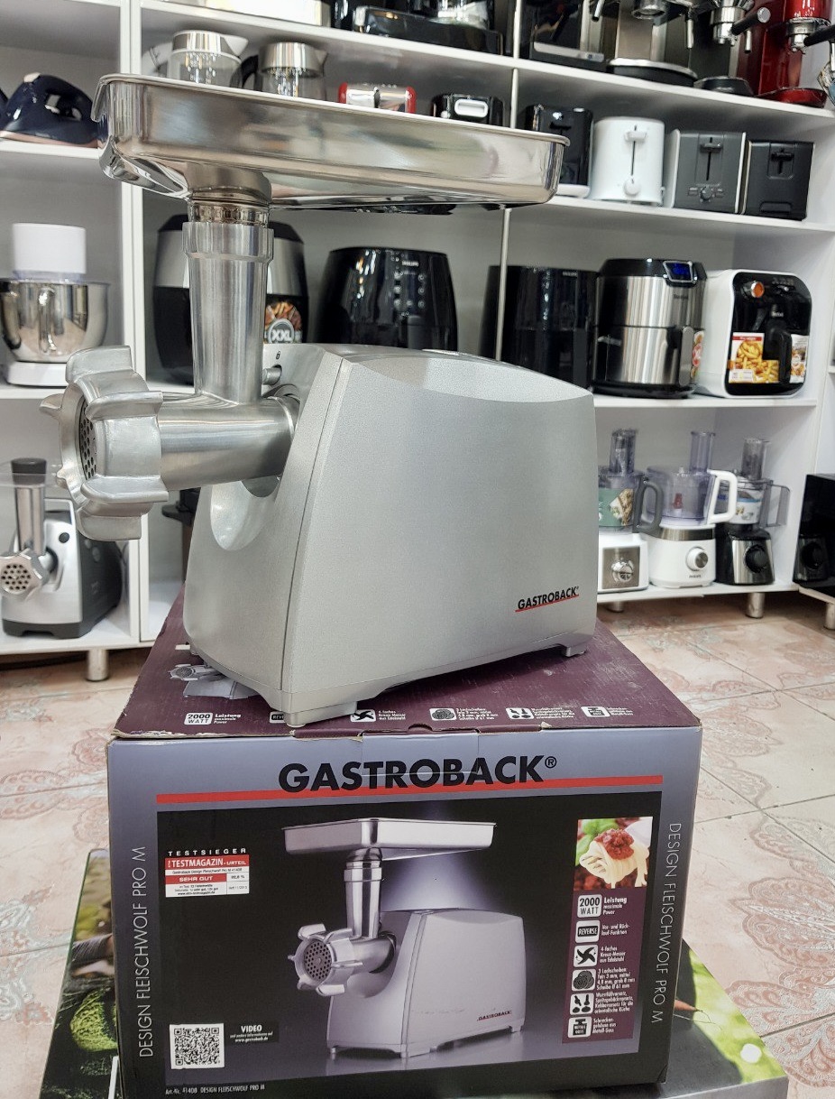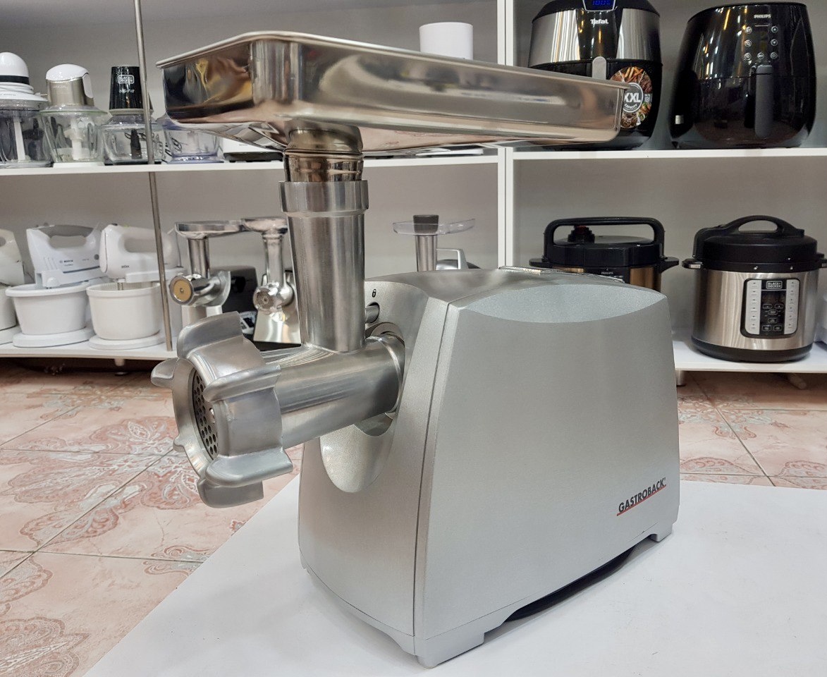 چرخ گوشت گاستروبک مدل 41408 دستگاهی با طراحی بسیار زیبا و شیک میباشد که از تولیدات برند گاستروبک بوده وجود موتور بسیار قدرتمند با توان ۲۰۰۰ وات و توان مصرفی ۶۰۰ وات برق این محصول را به یک چرخ گوشت ابرقدرت تبدیل کرد است شما میتوانید با این دستگاه گوشت را چرخ نمایید. شما با خرید این دستگاه یک عدد کبه ساز یک عدد سوسیس ساز یک عدد ابزار مخصوص ساخت بیسکویت را نیز در اختیار خواهید داشت همچنین این دستگاه به دلیل دارا بودن دکمه عملکرد معکوس قادر است موادی که داخل چرخ گوشت گیر کرده و موجب انسداد گلویی و گیر کردن تکه گوشت در دستگاه شده است را رفع نماید و از ایجاد مشکل براش شما جلو گیری نماید.