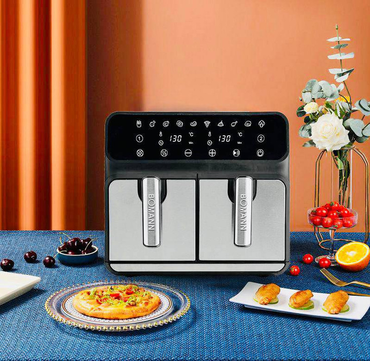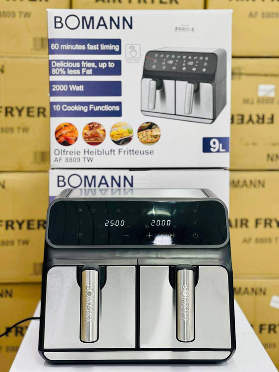 سرخکن دوقلو رژیمی مارک بومن آلمان مدل AF8809 TW این محصول ساخت کشور آلمان بوده و دارای ظرفیت ۹ لیتر میباشد شما میتوانید از این محصول در دامنه تایم ۸۰ تا ۲۰۰ درجه سانتیگراد استفاده کنید.همچنین توانایی پخت دو ماده غذایی را به طور جداگانه با دو دمای متفاوت را داراست یعنی شما میتوانید در یک سبد یک ماده غذایی و در سبد دیگر ماده غذایی دیگر را طبخ نمایید و به راحتی تهیه کرده و در کنار خانواده لذت ببرید.