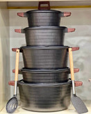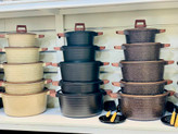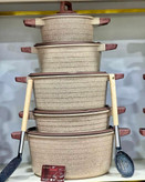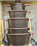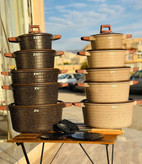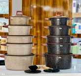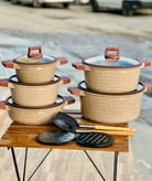 دستههای نسوز با طرح چوب علاوه بر زیبایی استفاده ایمن و راحت از قابلمهها را تضمین میکنند پوشش داخلی این سرویس از جنس گرانیت نچسب بوده که علاوه بر جلوگیری از چسبیدن غذا شستشوی آن را بسیار آسان میکند مزایای استفاده از این سرویس شامل کیفیت ساخت بالا پوشش گرانیت نچسب طراحی زیبا و منحصر به فرد توزیع یکنواخت حرارت دربهای پیرکس با سوپاپ خروج بخار مناسب برای انواع اجاق گازها و شستشوی آسان است.